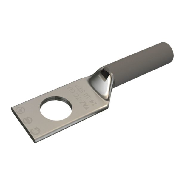 6 AWG CU, dos agujeros, tamaño de espárrago 3/8, distancia entre agujeros 1, barril estándar, ventana de inspección, chaflán interno, estañado, UL/CSA, 90°C, hasta 35kV, código de color azul, índice de matrices 7 ó 374.