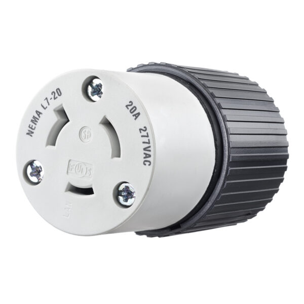 Dispositivos de bloqueo, industrial, cuerpo de conector hembra de nylon, 20A 250V, 2 polos 3 hilos con toma de tierra, L6-20R, terminal de tornillo, negro y blanco.